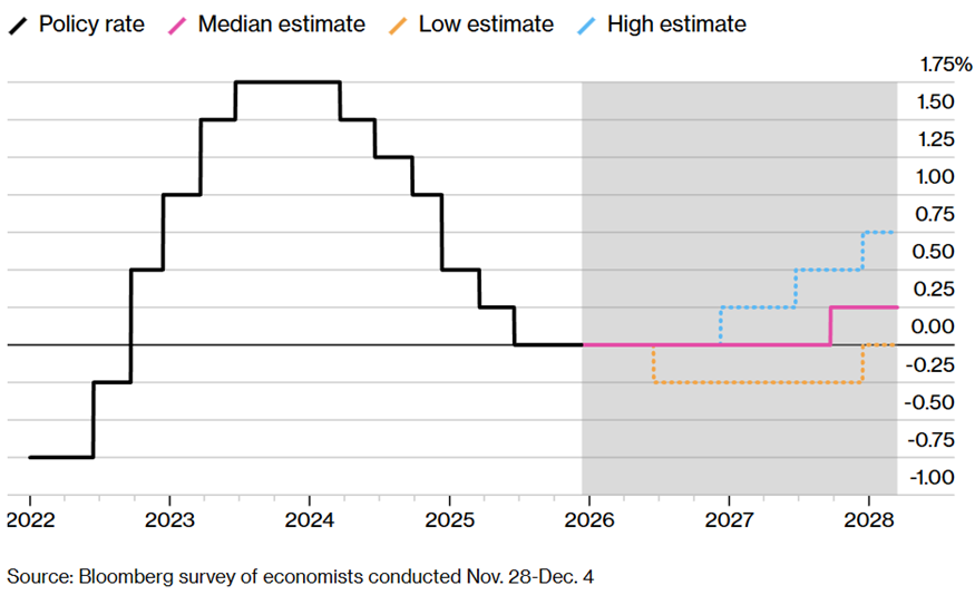 Die Schweizerische Nationalbank hat den Leitzins seit 2024 schrittweise von 1.75% auf 0.00% gesenkt. Laut Analysten ist in den nächsten zwei Jahren kein Anstieg in Sicht – Negativzinsen sind nicht ausgeschlossen.
